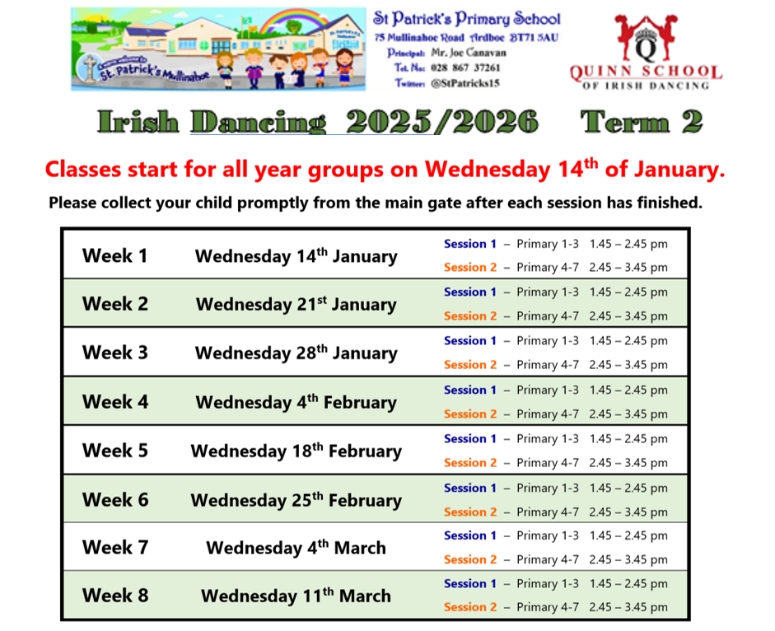Our Irish Dancing will resume in Term 2 for all the boys and girls in the school P1 –P7. Below are the dates up to the Easter Holidays. New members are welcome, there is no previous experience required to join this club. Pupils can wear trainers or dancing shoes (dancing shoes are not compulsory for beginners).